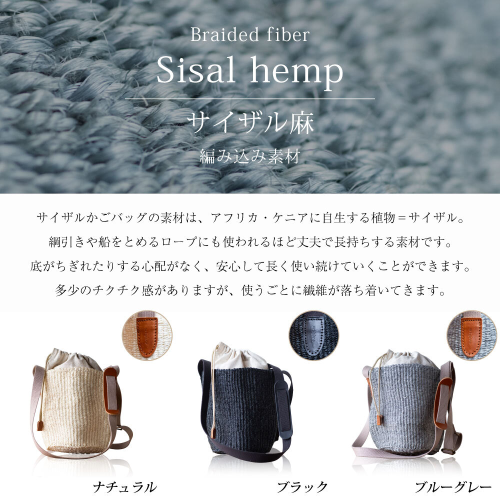 ショルダーの両端にはレザーをあしらい、サイザル素材をより引き立てるデザインに仕上げています。
