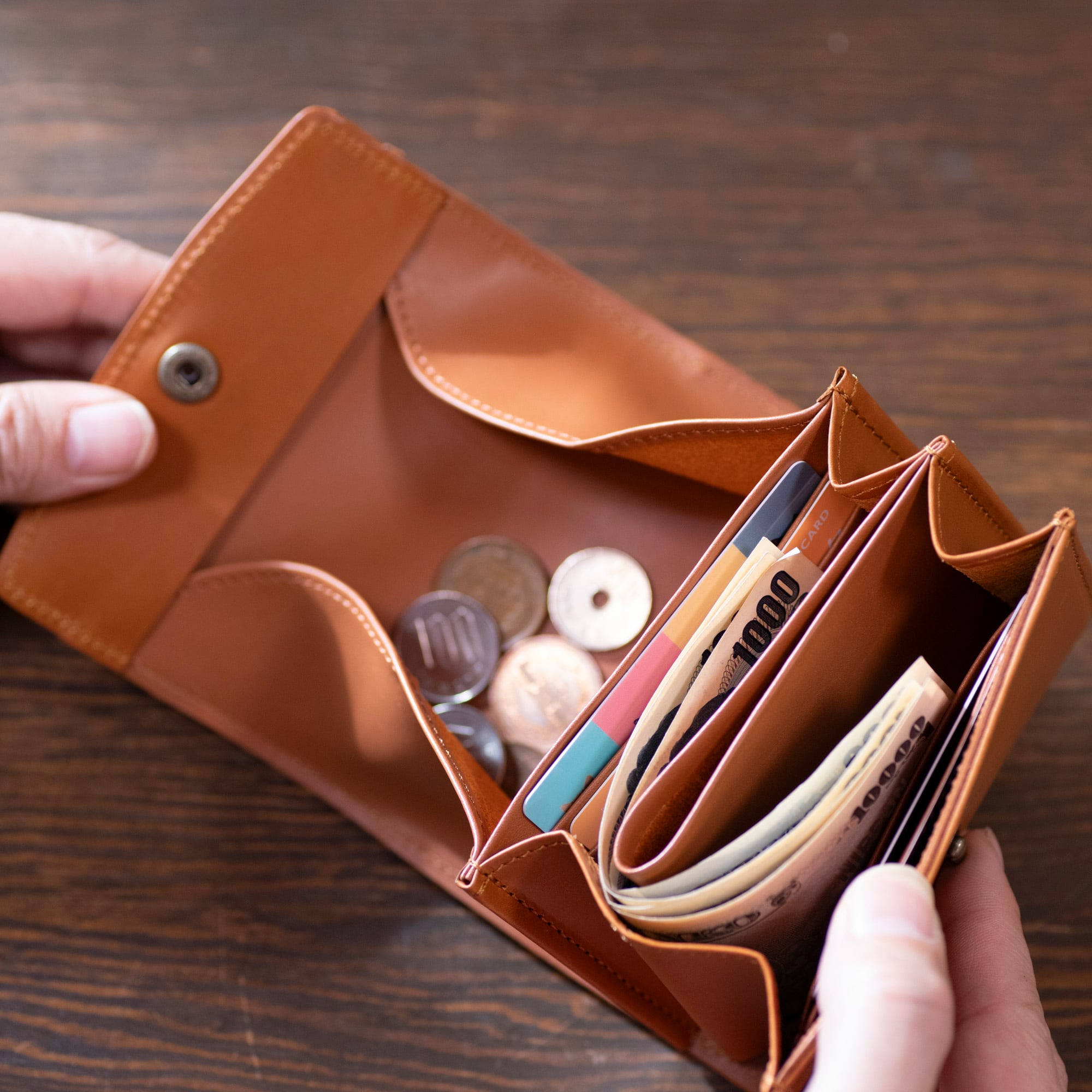 手のひらにしっかり握れる、少し厚めの二つ折り財布。