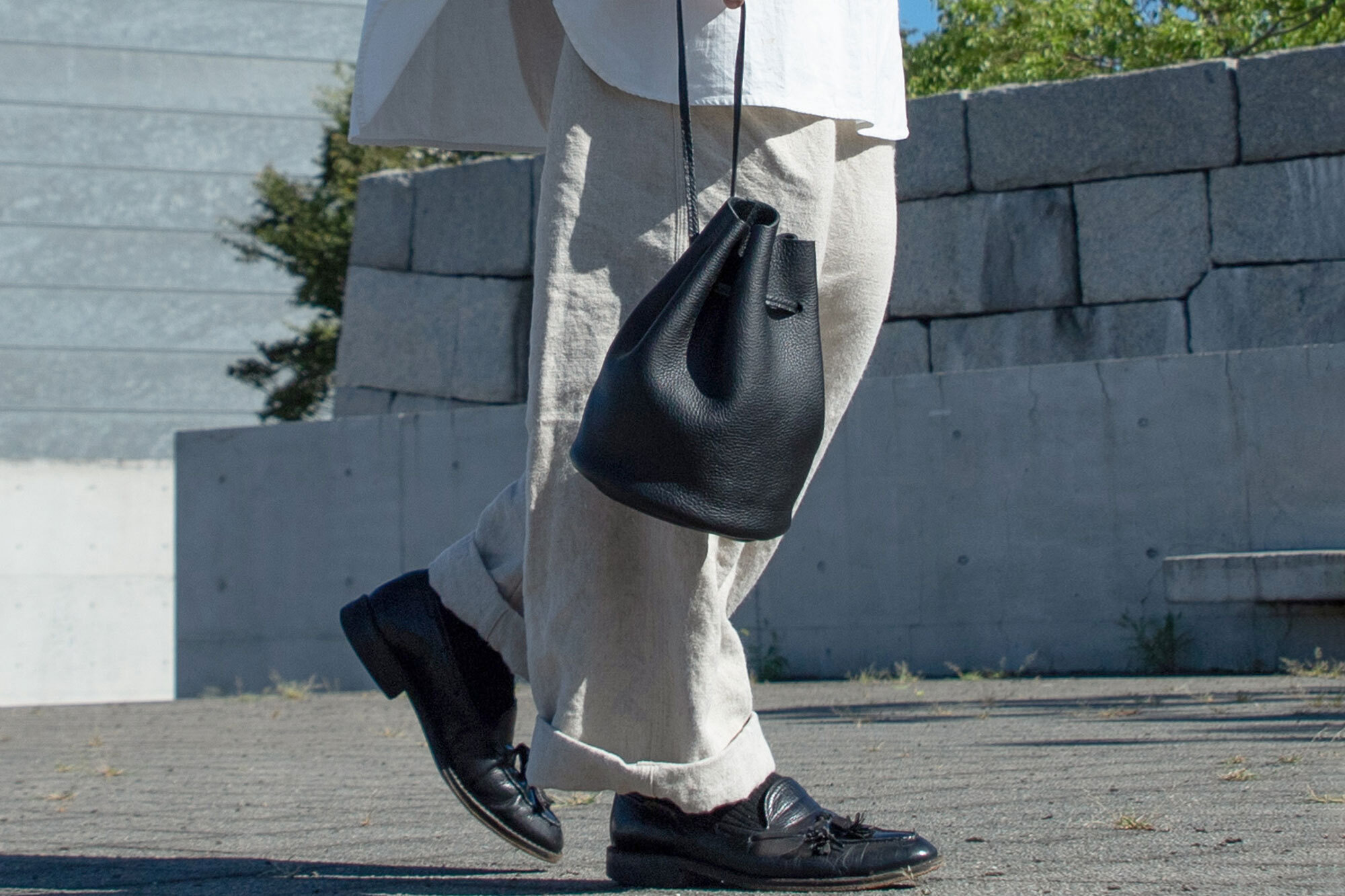 シンプルなスタイルに、目を引くアイテムのスモールサイズのレザー巾着!