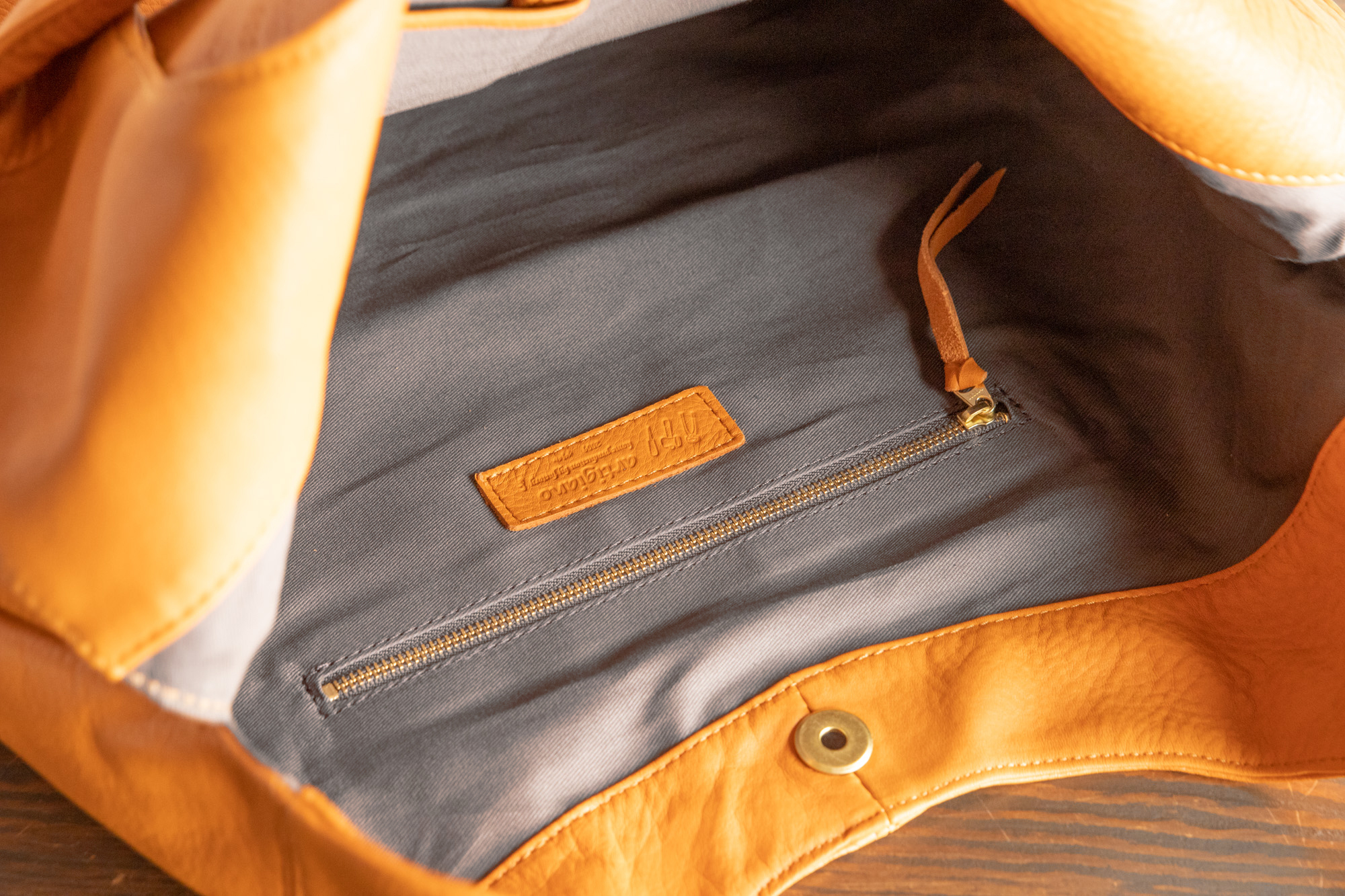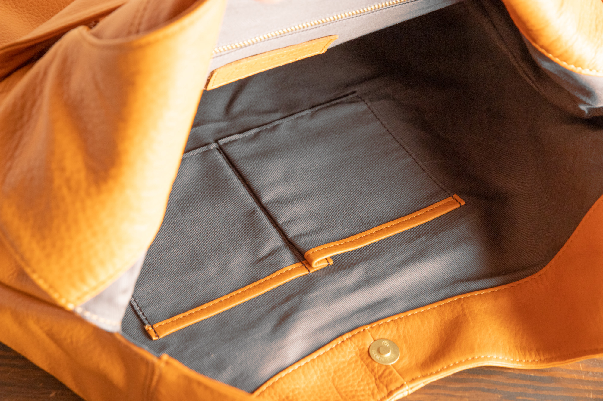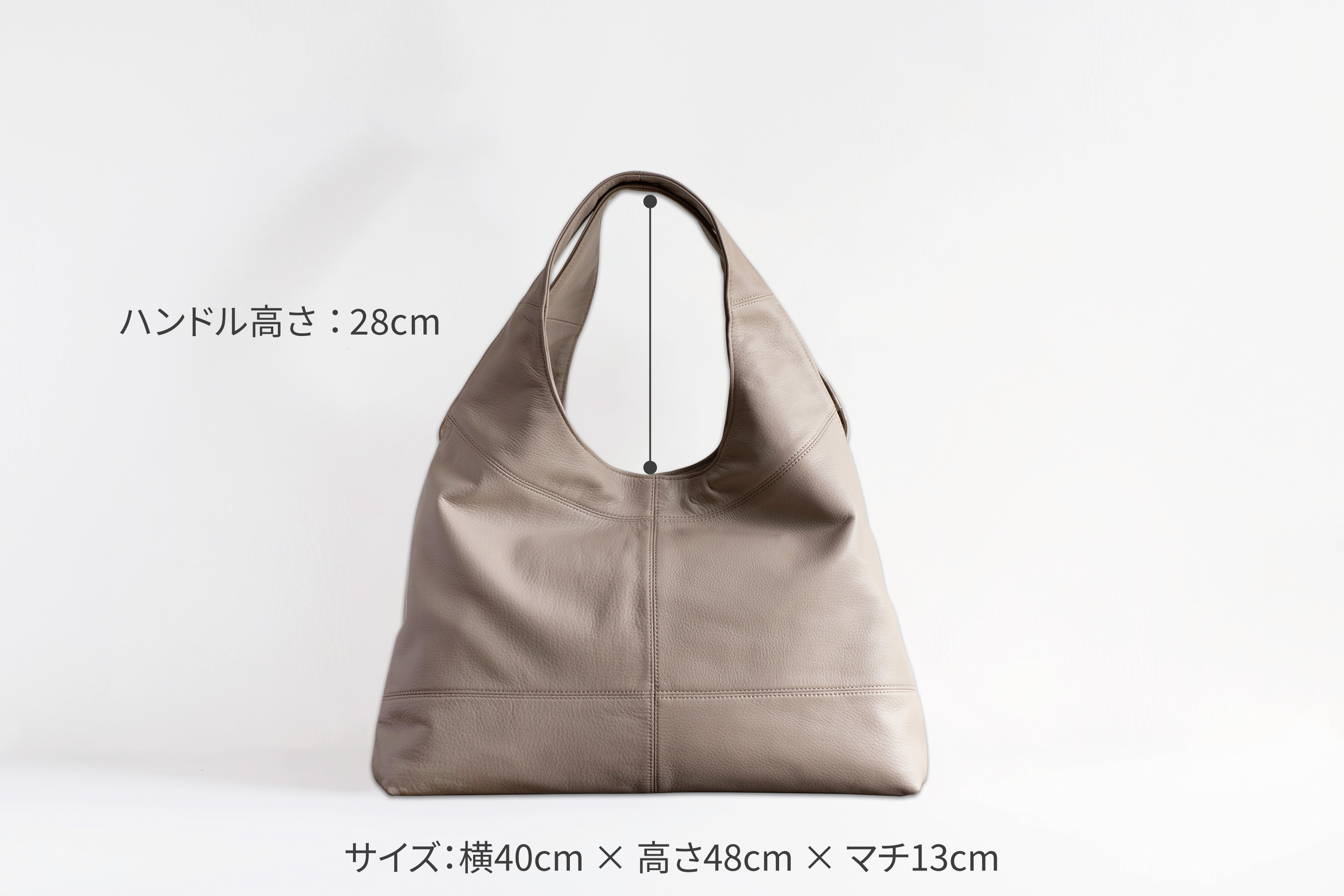 くったりとした肌触りと立体感を併せ持ち、広めの底マチとスマートなシルエットのバランスにより、A4サイズの書類や雑誌もたっぷり収まる収納力を確保しました。